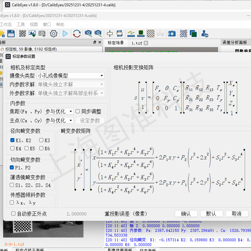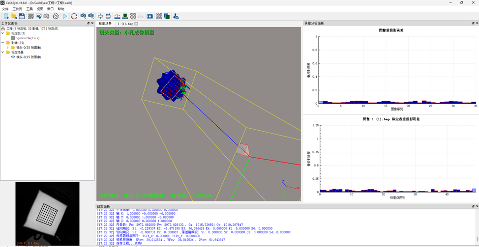 CalibEyes自动化程度高,操作简单,强大的标定点可视化修正功能,可及时发现并修正影响精度的标定点,支持18参数组合Brown/Conrady模型、支持鱼眼Kannala-Brandt 模型、支持鱼眼全向MEI模型(Unified Camera Model)、支持薄棱镜畸变模型(Thin Prism model),为您提供一个高精度的相机标定方案。